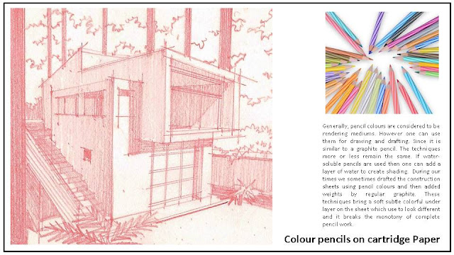 Generally, pencil colours are considered to be rendering mediums. However one can use them for drawing and drafting. Since it is similar to a graphite pencil. The techniques more or less remain the same. If water-soluble pencils are used then one can add a layer of water to create shading. During our times we sometimes drafted the construction sheets using pencil colours and then added weights by regular graphite. These techniques bring a soft subtle colorful under layer on the sheet which use to look different and it breaks the monotony of complete pencil work.